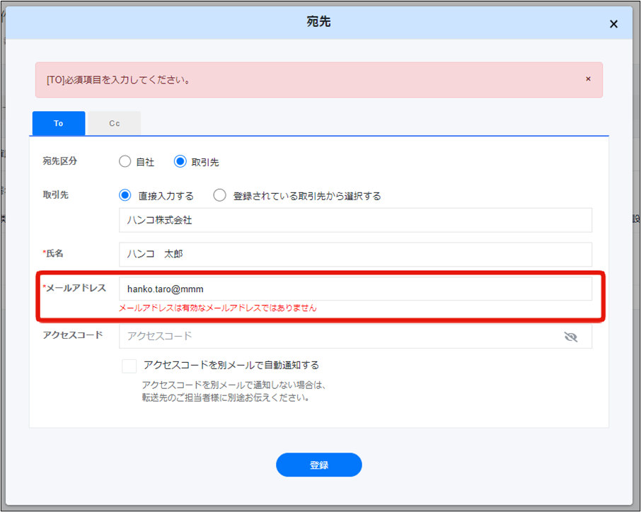 書類作成>[3.送信先設定]の宛先追加画面にて、メールアドレス入力時にエラーが出る場合がございます。